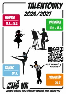 Z důvodu konání talentových přijímacích zkoušek bude 13. května na hudebním oboru ředitelské volno. Ostatní obory (taneční, výtvarný, literárně dramatický obor) mají výuku podle rozvrhu. Děkujeme za pochopení.
