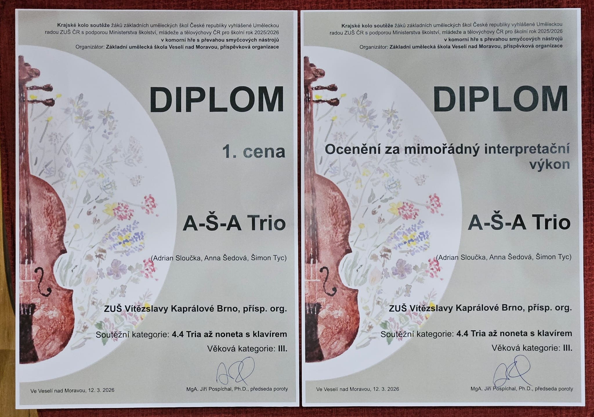 Anežka Hladíková získala na soutěži O hudbe chcem vedieť viac! 2026 pořádané VŠMU Bratislava 1. cenu, Matouš Netolický 2. cenu, Dita Salamonová 3. cenu, (všichni ped. P. Kopůncová), a Petra Kopůncová Diplom za přípravu žáků. Gratulujeme!